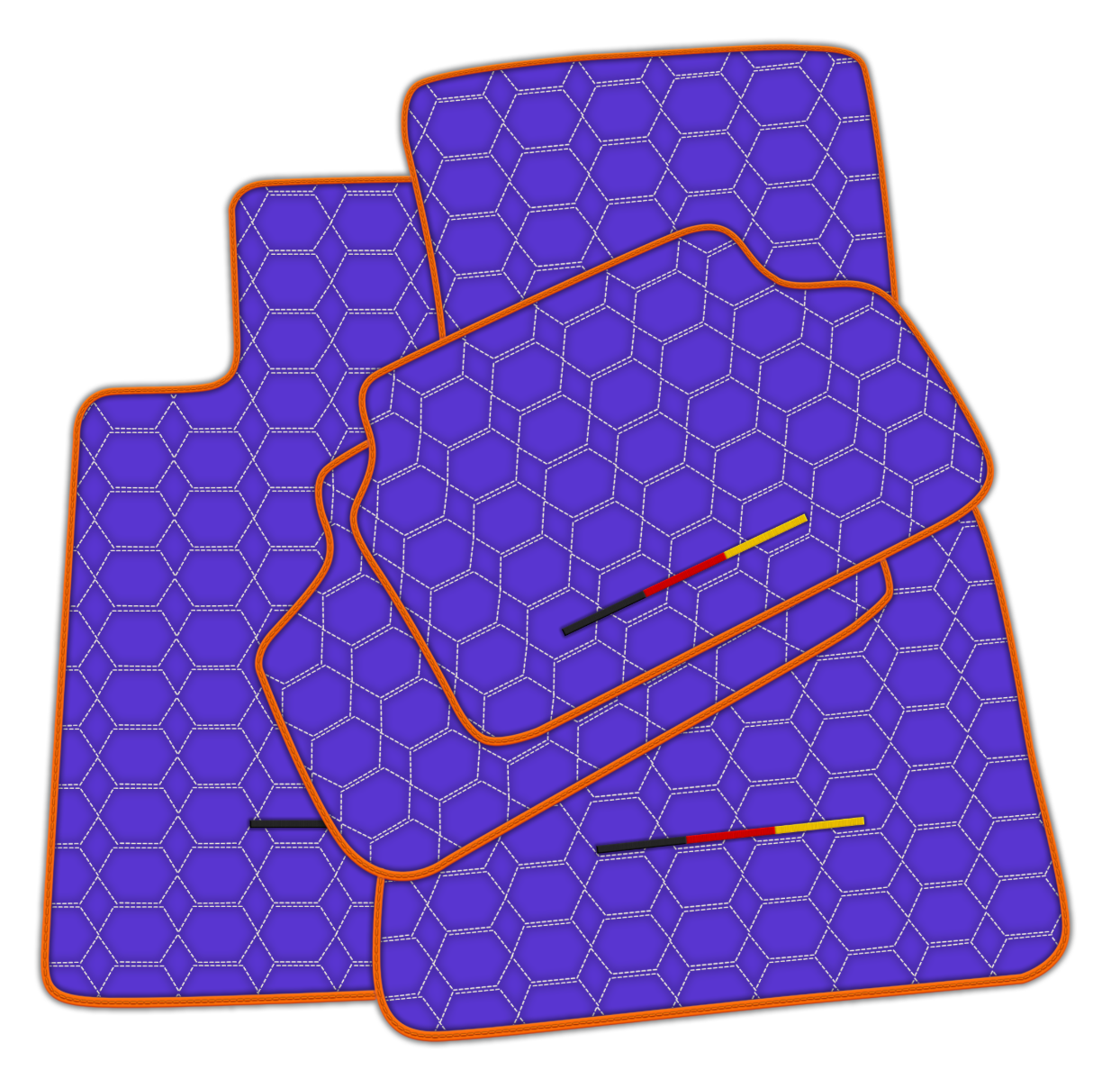 Atualize o interior do seu carro com os nossos tapetes de carro em pele roxa para BMW. Feitos de pele de alta qualidade, estes tapetes apresentam um elegante padrão hexagonal com costuras brancas e uma borda laranja atraente. Mostre o seu orgulho alemão com a bandeira alemã incluída. Eleve a sua experiência de condução hoje.